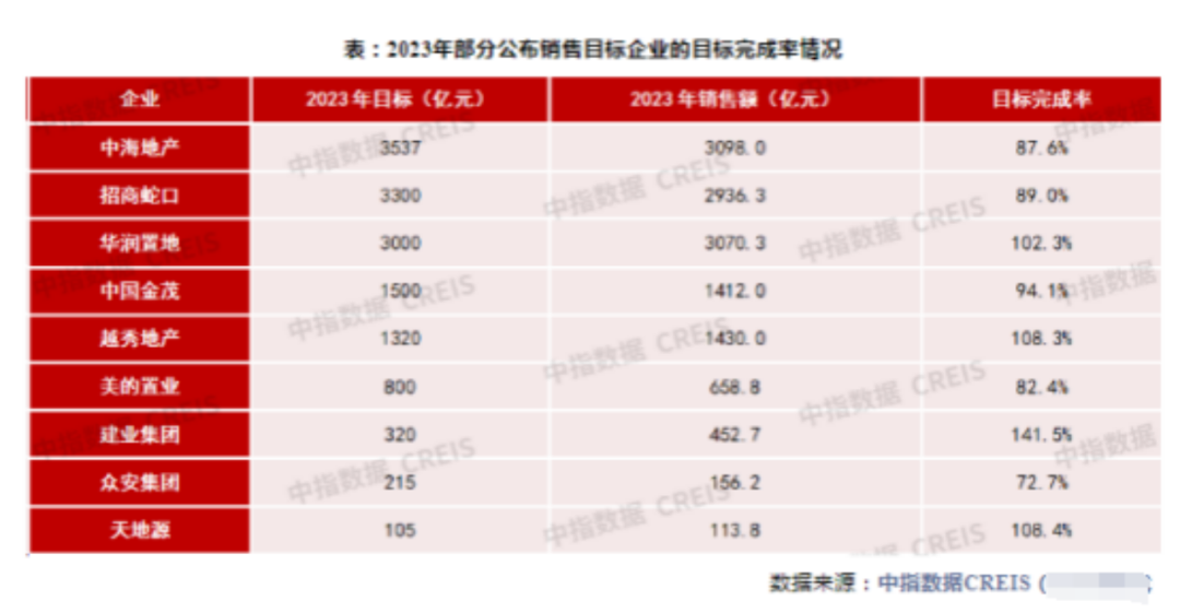 根据中指研究院数据,2023年部分公布销售目标的企业中,越秀地产、华润置地、建业集团、天地源均超额完成了销售目标。