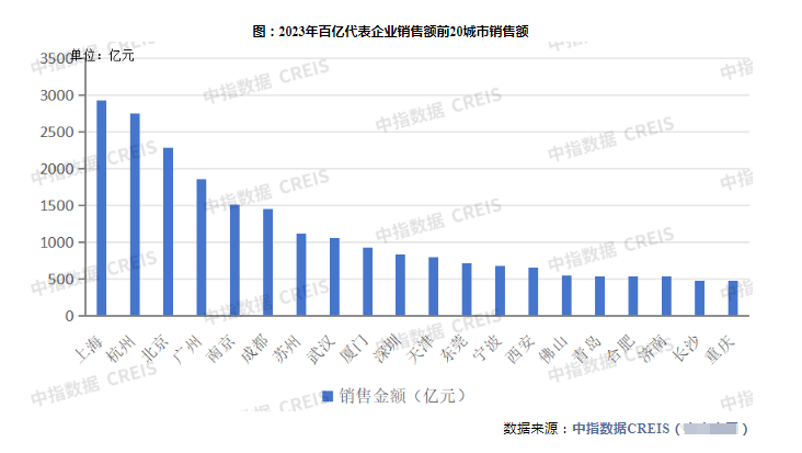 2023年百亿代表房企销售额前20的城市中,上海、杭州、北京、广州、南京、成都、苏州、武汉、厦门、深圳分列前十。城市分布上,长三角、粤港澳(内地)、京津冀三大城市群销售合计占比超六成。此外,成渝城市群区域内需求旺盛,销售占比同比提升1.24个百分点。