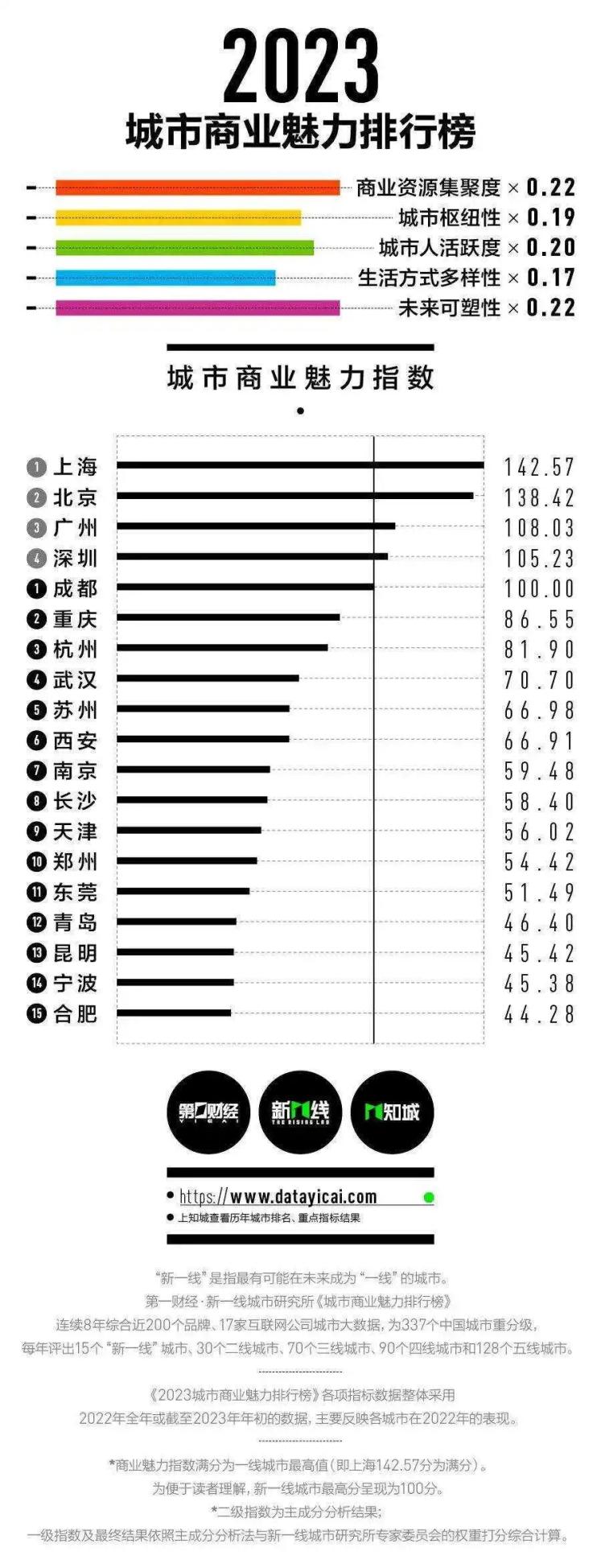 作为一份连续8年发布的城市榜单,《城市商业魅力排行榜》已形成了稳定的维度体系和算法模型:以近200个主流消费品牌商业门店数据、17家各领域头部互联网公司和数据机构的城市大数据为基础,围绕商业资源集聚度、城市枢纽性、城市人活跃度、生活方式多样性和未来可塑性五大维度为中国城市分级。其中,榜单的一级与二级维度权重以新一线城市研究所专家委员会打分的方式计入,二级维度以下指标数据则采用主成分分析法。