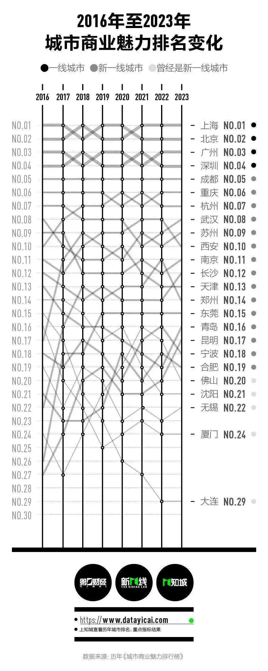 2013年,《第一财经周刊》(现《第一财经》YiMagazine)首创“新一线城市”的概念,以城市中的商业魅力和线上数据所反映出的人口活力来重新评估城市,打破了传统上依赖行政级别、GDP、人口规模等数据的城市评价方式。10年后的今天,第一财经·新一线城市研究所每年更新的《城市商业魅力排行榜》已经成为中国城市数据研究领域中被广泛引用的一套城市分级体系。