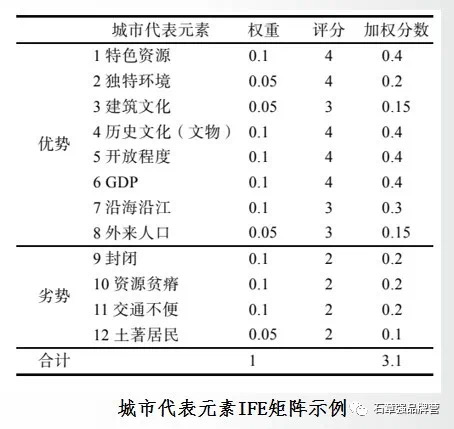 IFE 分析是内部因素评价矩阵分析,是对内部因素优劣定性定量的分析工具,其做法是从优势和劣势两个方面找出影响城市未来发展的关键因素。