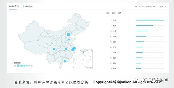 根据百度指数数据显示,从2013年到2023年,关键词“城市品牌”的用户画像显示除北京外,杭州的城市品牌流量曝光是最多的。北京是我国首都,其城市品牌的知名度不言而喻,随着国内城市品牌意识的觉醒,杭州、上海、成都以及武汉等城市都开始打造出属于自身的城市超级品牌符号。