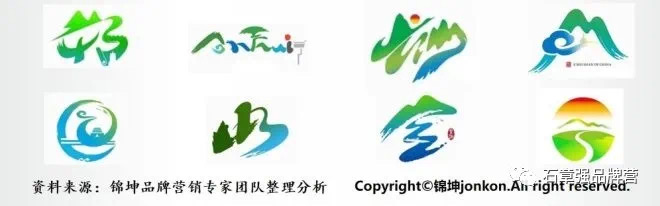 将本地风景地貌抽象化形成logo的主要视觉元素一直是许多城市品牌青睐的表现形式,使用蓝绿色配色加上写意的书法笔触能够给人以生态和人文气息,但是这样的表现形式太过普遍,加上色调大同小异,极大的削弱了品牌符号的辨识度,让人产生审美疲劳。