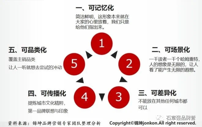 作为多年来辅导和服务了400多家专精特新企业、300多个行业第一品牌和200多个上市公司和100多个城市品牌的全国头部品牌服务商,锦坤品牌创始人石章强提出了城市品牌符号可记忆化、可场景化、可差异化、可传播化和可品类化的“五可五化”衡量标准和方法论体系。