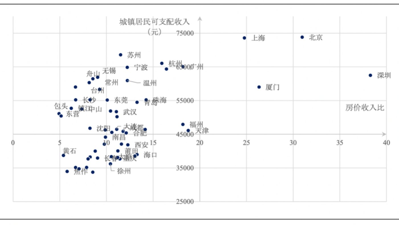 可以看到,一二线城市的绝对购买力高但是相对购买力很低。深圳的房价收入比达到了38.3,比第二名北京的31高23.55%。