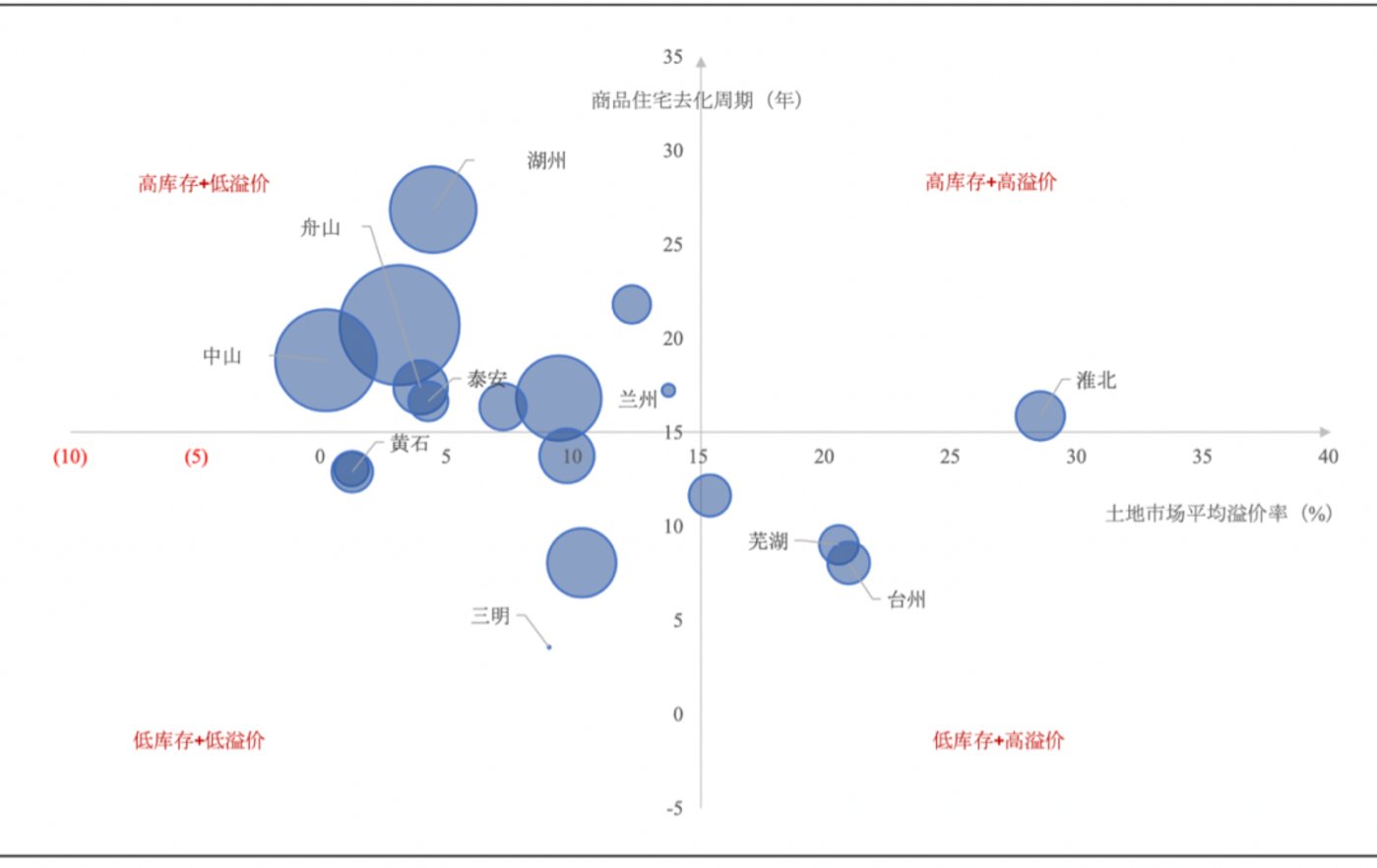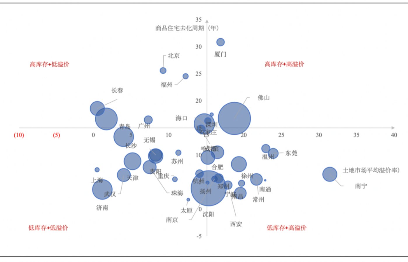 以合理库存去化周期(15个月),土地溢价率(中位数15%)为两大维度交叉分析,可以将59个城市划分为四个象限。