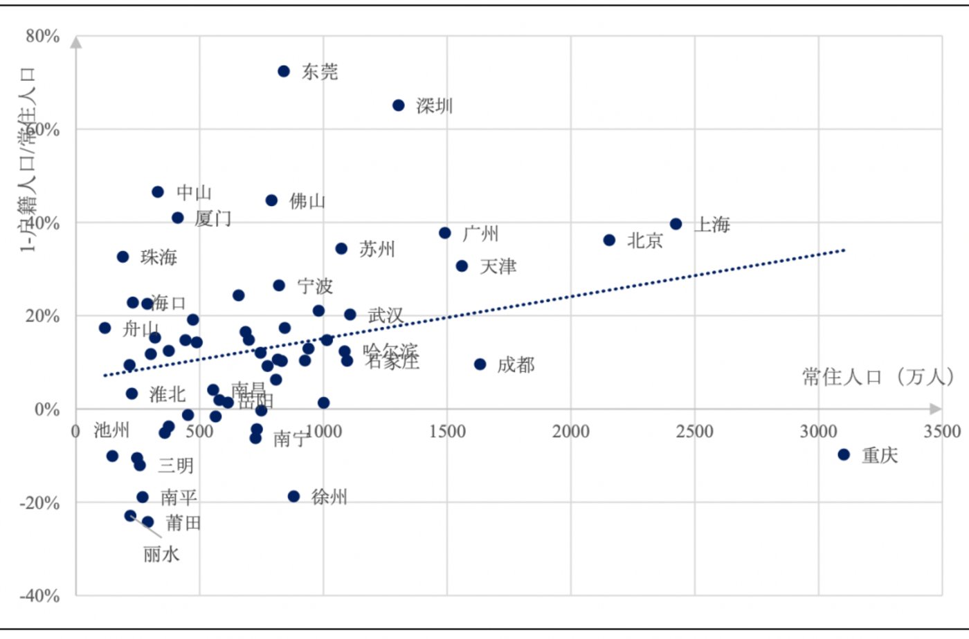 结合常住人口进行分析,北京、上海的城市容纳力领先于除重庆之外的其他城市,外来人口比例也在40%左右,其房地产市场享有巨大的人口红利支撑。