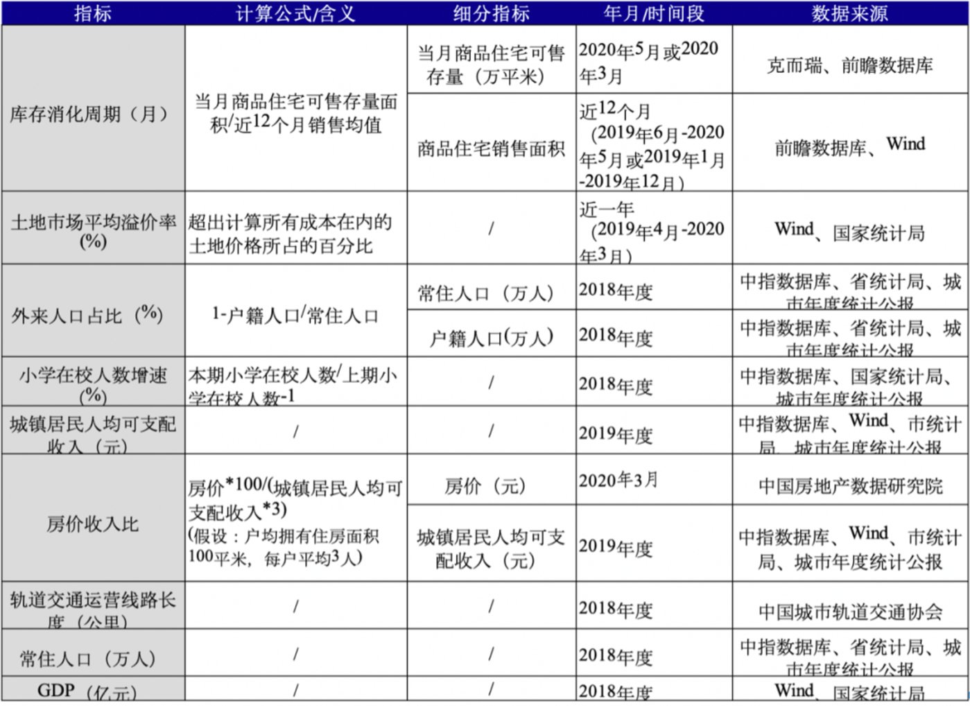 长期指标方面,我们考察了人口表观因素、潜在因素以及居民购买力,进一步可以细分为五个方面——居民构成、年龄结构、城市化水平、城市规模、居民购买力,并分别采用“外来人口占比”、“小学在读人数增速”、“轨道交通里程”、“2018年社会生产总值”和“常住人口”、“城镇居民人均可支配收入”、“房价收入”等指标来衡量。