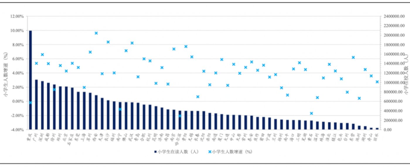 从增速上来说,西安小学在校人数增长最快,接近10%,其次是长沙、武汉、贵阳、南京等二线发达城市。