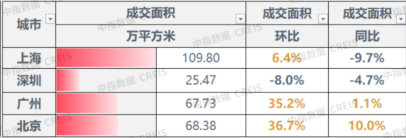 12月,一线城市整体成交面积环比上涨17.51%,同比略降2.22%。分城市来看,除深圳外,其他三城市环比均上涨,其中北京环比涨幅最大为36.7%,广州次之,为35.2%;同比来看,北京、广州同比上涨,北京涨幅最大,为10.0%;上海、深圳则同比下降,上海降幅最大,为9.7%。