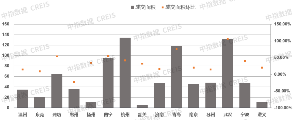12月,二线代表城市成交面积环比大涨49.16%,各城市均同步上涨;同比仍下降,但降幅收窄,为8.99%。其中,武汉环比涨幅最大,为106.30%,苏州涨幅最小,为14.50%。三四线代表城市成交量环比小幅上涨,涨幅为9.66%,同比稳中有降。其中,柳州、潍坊环比上涨显著,涨幅分别为64.73%和54.32%。惠州、眉山跌幅最大,分别为22.81%和20.77%。