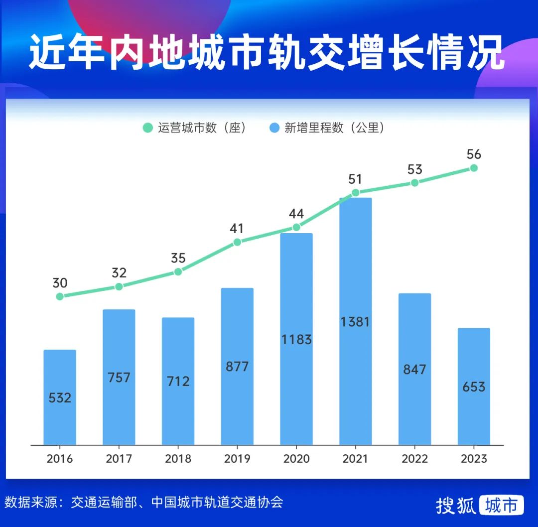 2023年,中国共有26座城市开通了轨交新线或新段,城市轨道交通新增里程653公里*,相比2022年,增速进一步放缓。