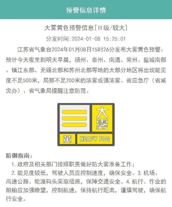 预计今天夜里到明天早晨,扬州、泰州、南通、常州、盐城南部、镇江东部、无锡北部和苏州北部等地的大部分地区将出现能见度不足500米,局部不足200米的浓雾或强浓雾。省应急厅(省减灾办)、省气象局提醒注意防范。