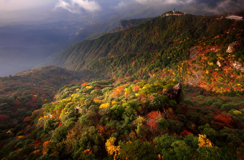 秋 · 红枫似火·童话世界:阳光穿透云层,金黄色的芦苇荡漾,漫步在十万亩高山草甸间,犹如徜徉金色童话世界之中。远处红叶泼墨,渲染了山峰,眼前层林尽染,千树红枫轻摇慢舞,从山脚到金顶姹紫嫣红,深秋如画,醉人心弦。