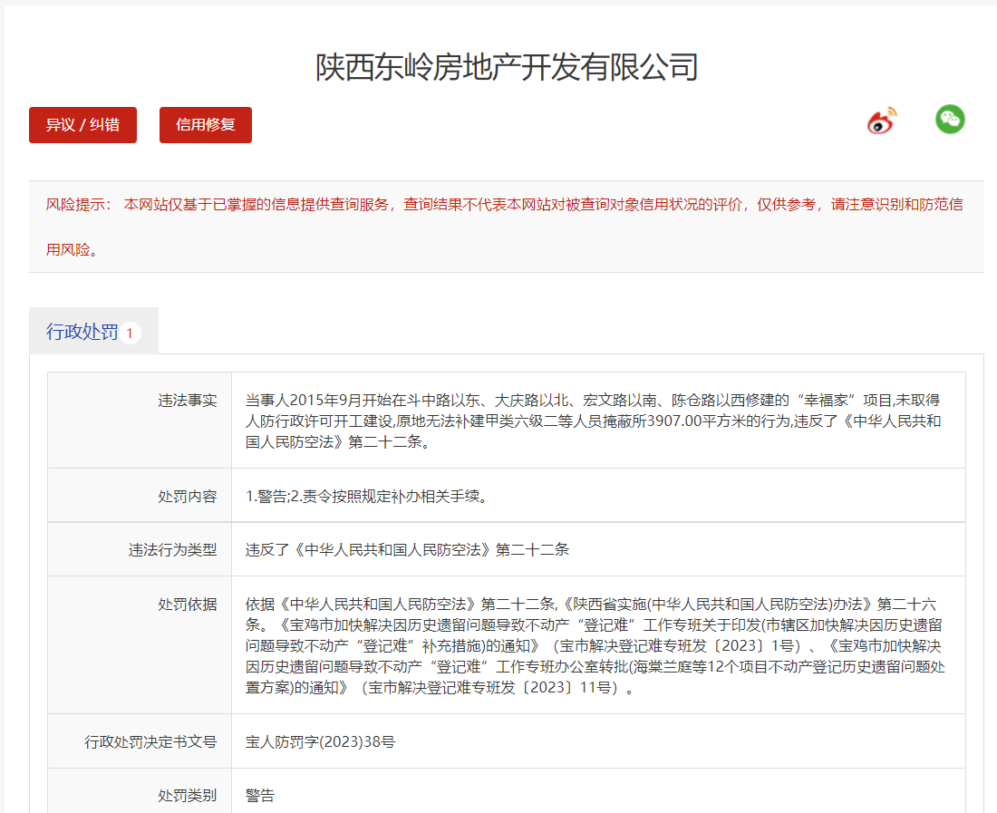 依据《中华人民共和国人民防空法》第二十二条,《陕西省实施<中华人民共和国人民防空法>办法》第二十六条,《宝鸡市加快解决因历史遗留问题导致不动产“登记难”工作专班关于印发(市辖区加快解决因历史遗留问题导致不动产“登记难”补充措施)的通知》(宝市解决登记难专班发〔2023〕1号),《宝鸡市加快解决因历史遗留问题导致不动产“登记难”工作专班办公室转批(海棠兰庭等12个项目不动产登记历史遗留问题处置方案)的通知》(宝市解决登记难专班发〔2023〕11号),宝鸡市国防动员办公室(宝鸡市人民防空办公室)对该公司处以警告,并责令其按照规定补办相关手续。作出处罚决定日期为2023年12月27日。