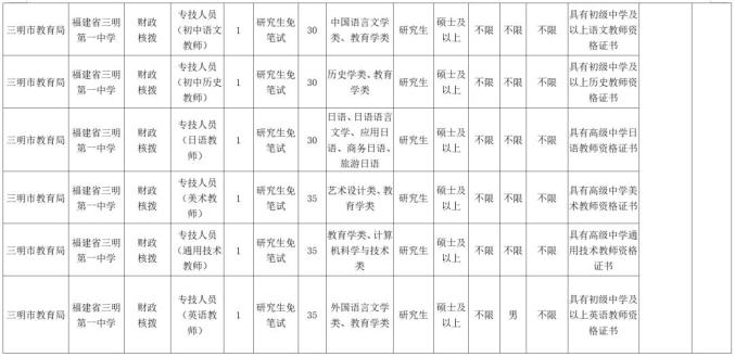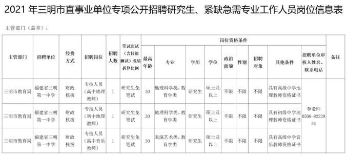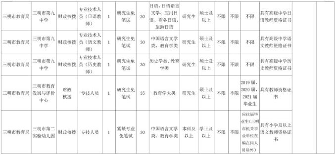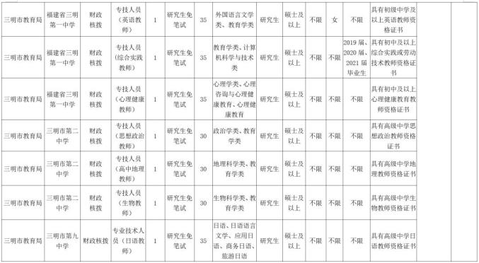 ●三明市直单位专项招聘研究生和紧缺急需专业新任教师21名