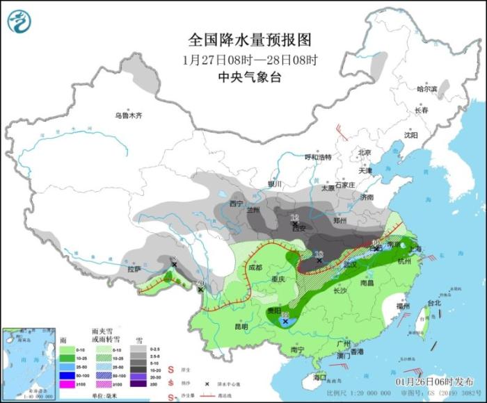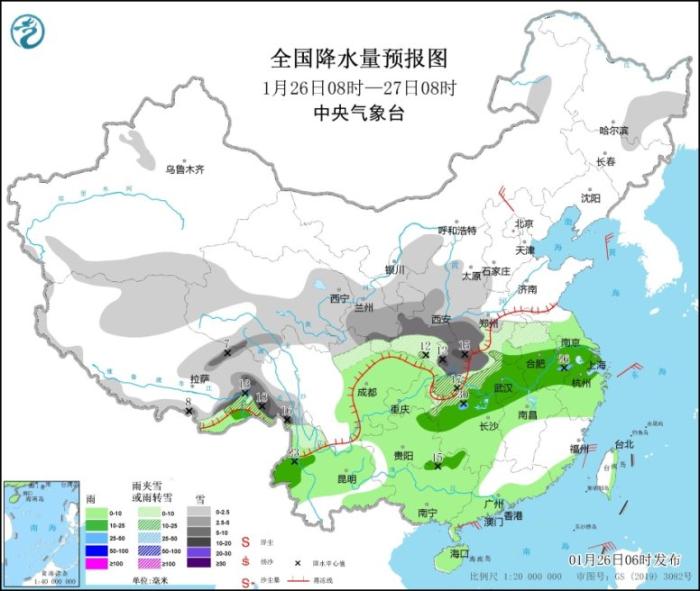 1月26日8时至27日8时,内蒙古河套地区、黑龙江东部、西藏北部和东部、西北地区中东部、山西中南部、黄淮西部、江汉、云南西北部、川西高原北部等地部分地区有小到中雪或雨夹雪,其中,西藏东南部、甘肃南部、陕西中南部、河南西部、湖北中西部等地部分地区有大到暴雪(10~18毫米)。江淮大部、江汉东部、江南大部、西南地区东部和南部、华南大部等地部分地区有小到中雨,其中,安徽南部、湖南北部等地局地有大雨(25~30毫米)。内蒙古中部部分地区有4~5级风。