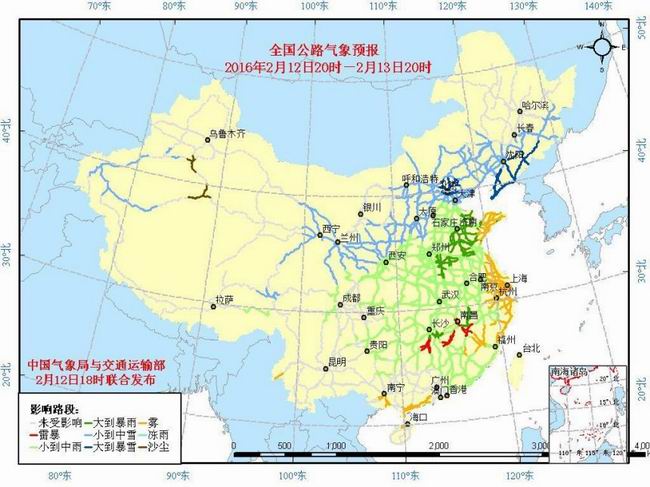 中国气象局与交通运输部2016年02月12日联合发布全国主要公路气象预报