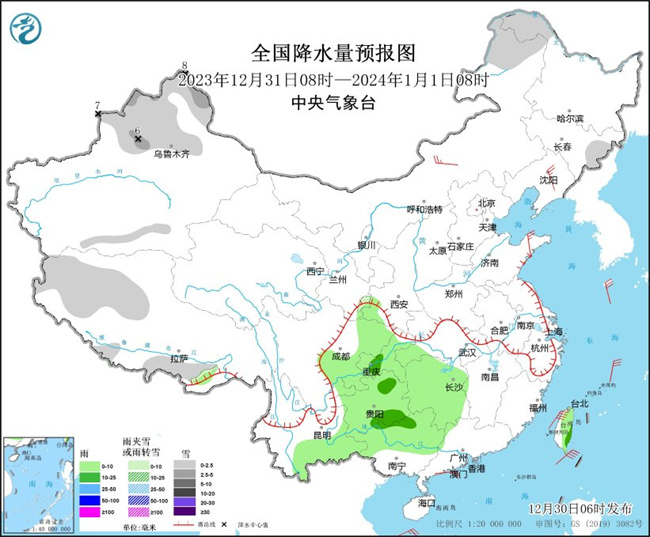2023年12月31日08时至2024年1月1日08时,内蒙古东北部、黑龙江西北部、新疆北部、西藏西部和南部等地部分地区有小雪或雨夹雪,其中,新疆北部等地部分地区有中到大雪(5~8毫米)。四川盆地东部、湖北西部、湖南大部、重庆、贵州、云南东南部、广西北部、台湾岛等地部分地区有小雨,其中,重庆南部、贵州中部和南部、广西北部、台湾岛东部等地部分地区有中雨。内蒙古中部、东北地区中南部、山东半岛等地部分地区有4~5级风(见图3)。