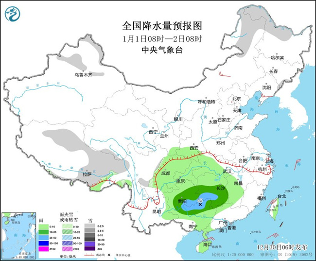 图2 全国降水量预报图(12月30日08时-31日08时)