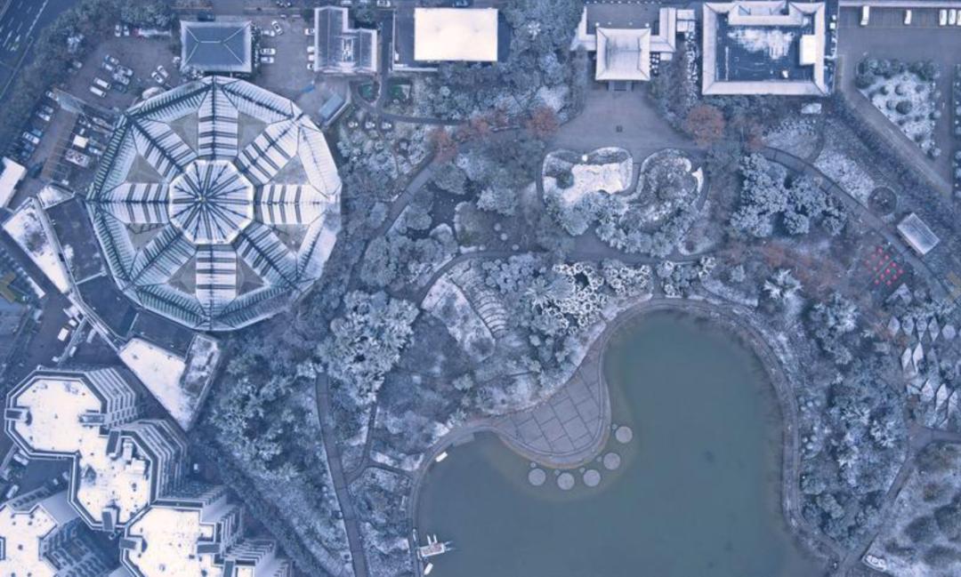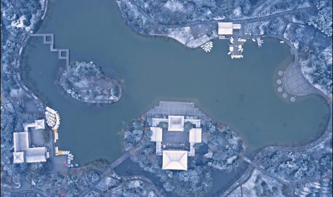 2月7日,空中鸟瞰丰庆公园,银装素裹分外妖娆, 美不胜收。记者 谢伟摄