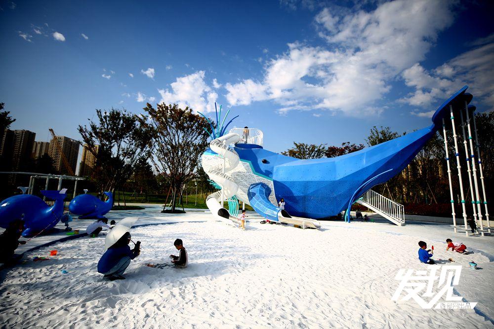 名为“鲸海奇旅”的儿童乐园,蓝鲸造型的滑梯与白色沙滩格外引人注目。