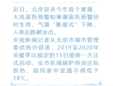 北京市丰台区供暖所生产部经理潘春军说,采暖季期间,居民家中室温应达到18℃。用户若遇到家中暖气不热、跑水漏水等情况,可直接拨打所在地对应供热企业或维修单位的服务电话进行报修,如遇问题解决不及时、服务态度恶劣等情况,可拨打市区两级供热监督电话投诉。