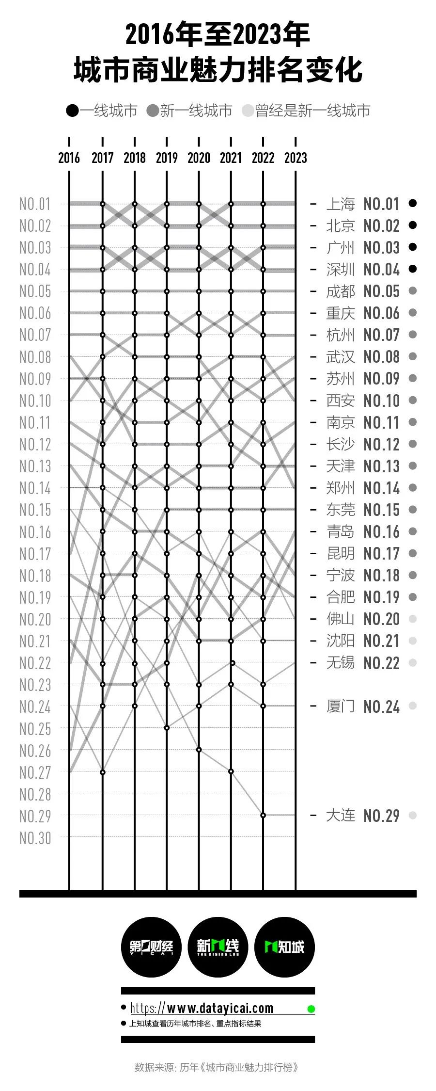 新一线城市研究所的《城市商业魅力排行榜》也已经连续发布到第8年。通过近200个品牌、17家互联网公司和数据机构的城市大数据,围绕商业资源集聚度、城市枢纽性、城市人活跃度、生活方式多样性和未来可塑性五大一级维度来评估337座地级及以上城市,2023年这份榜单里的15座新一线城市依次是成都、重庆、杭州、武汉、苏州、西安、南京、长沙、天津、郑州、东莞、青岛、昆明、宁波、合肥。