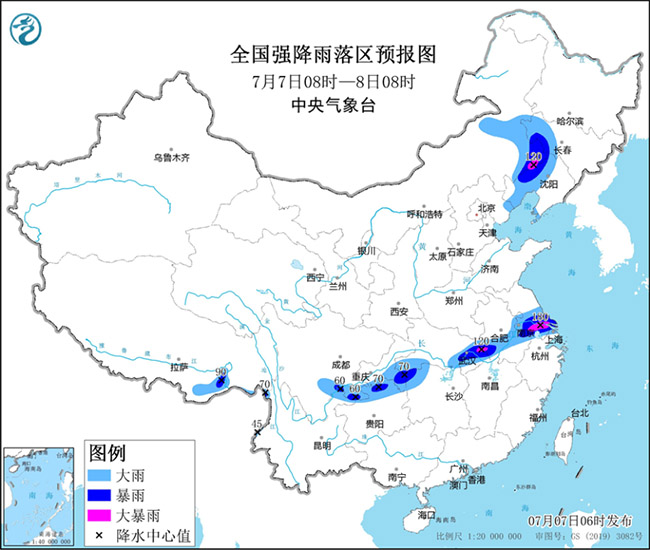 图1 全国强降雨落区预报图(7月7日08时-8日08时)