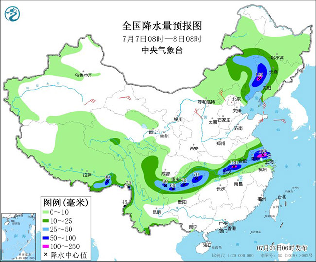 图4 全国降水量预报图(7月7日08时-8日08时)