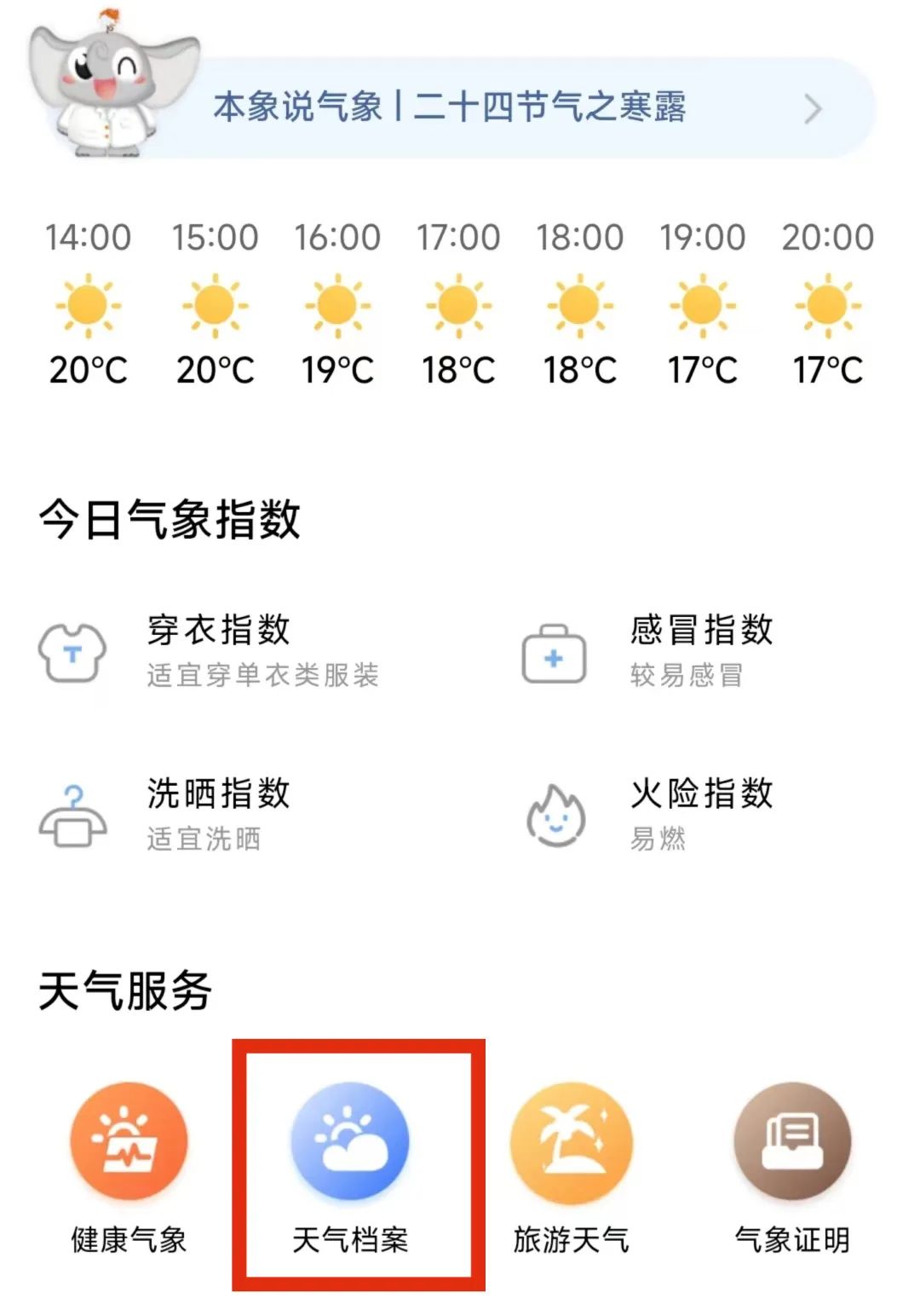 第一步:搜索进入【随申气象台】,下滑至底部点击「天气档案」。