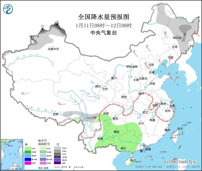 1月11日08时至12日08时,新疆北部、内蒙古东北部、黑龙江、吉林东部、川西高原南部等地的部分地区有小到中雪或雨夹雪,其中新疆阿勒泰、塔城、伊犁河谷等地的部分地区有大雪,局地暴雪(10~18毫米);四川南部、湖南西南部、贵州、云南东部、广西等地的部分地区有小雨。内蒙古中东部、东北地区南部、华北东部、山东半岛、西藏等地的部分地区有4~6级风;黄海北部、台湾海峡、台湾以东洋面、巴士海峡、南海东北部和西南部等海域有6~7级风、阵风8~9级(见图3)。