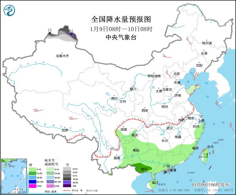 图1 全国降水量预报图(1月9日08时-10日08时)