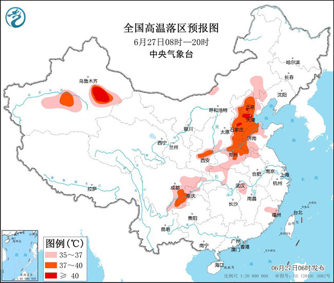 图1 全国高温落区预报图(6月27日08时-20时)
