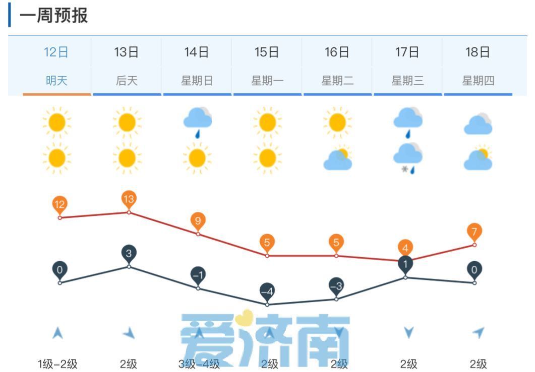 13日多云转阴,早晨有雾或轻雾,夜间东北部地区有小雨雪,降水概率40%,南风转北风2~3级,最低气温济阳区、莱芜区、钢城区、商河县、南山区、起步区-2℃左右,市区及其它区县3℃左右,最高气温13℃左右。