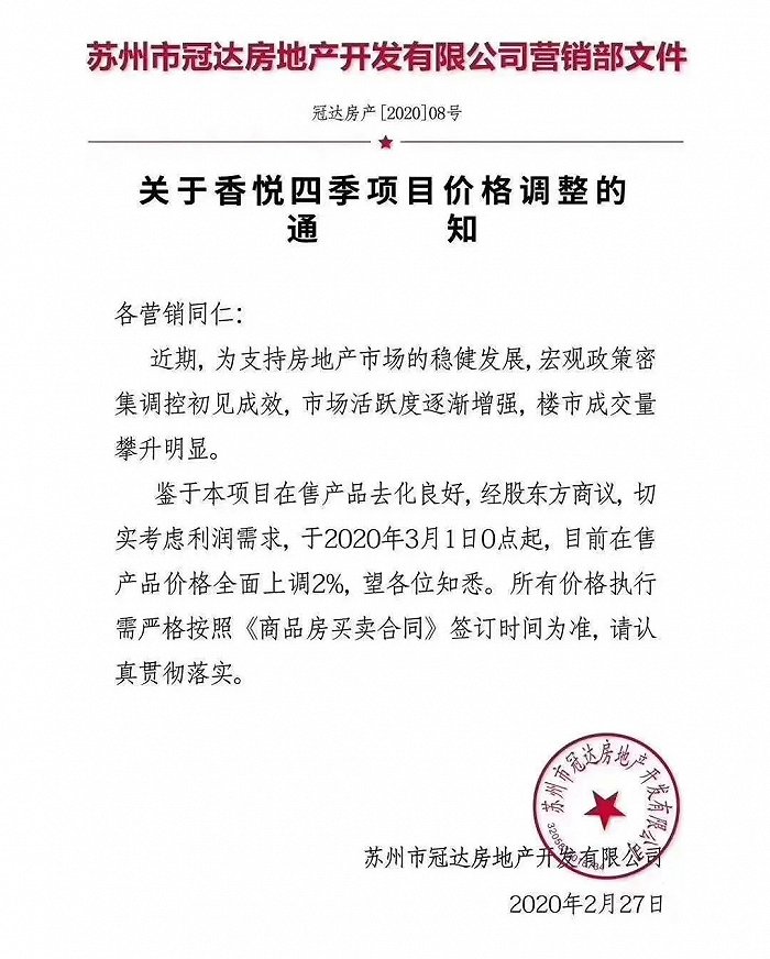位于苏州的香悦四季雅苑项目发布了价格调整通知,表示从3月1日开始,目前在售的产品价格全面上调2%。