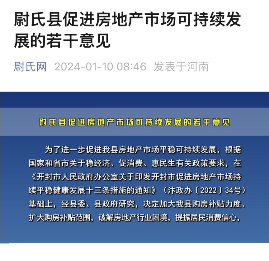 1月10日,河南开封尉氏县发布了《促进房地产市场可持续发展的若干意见》。