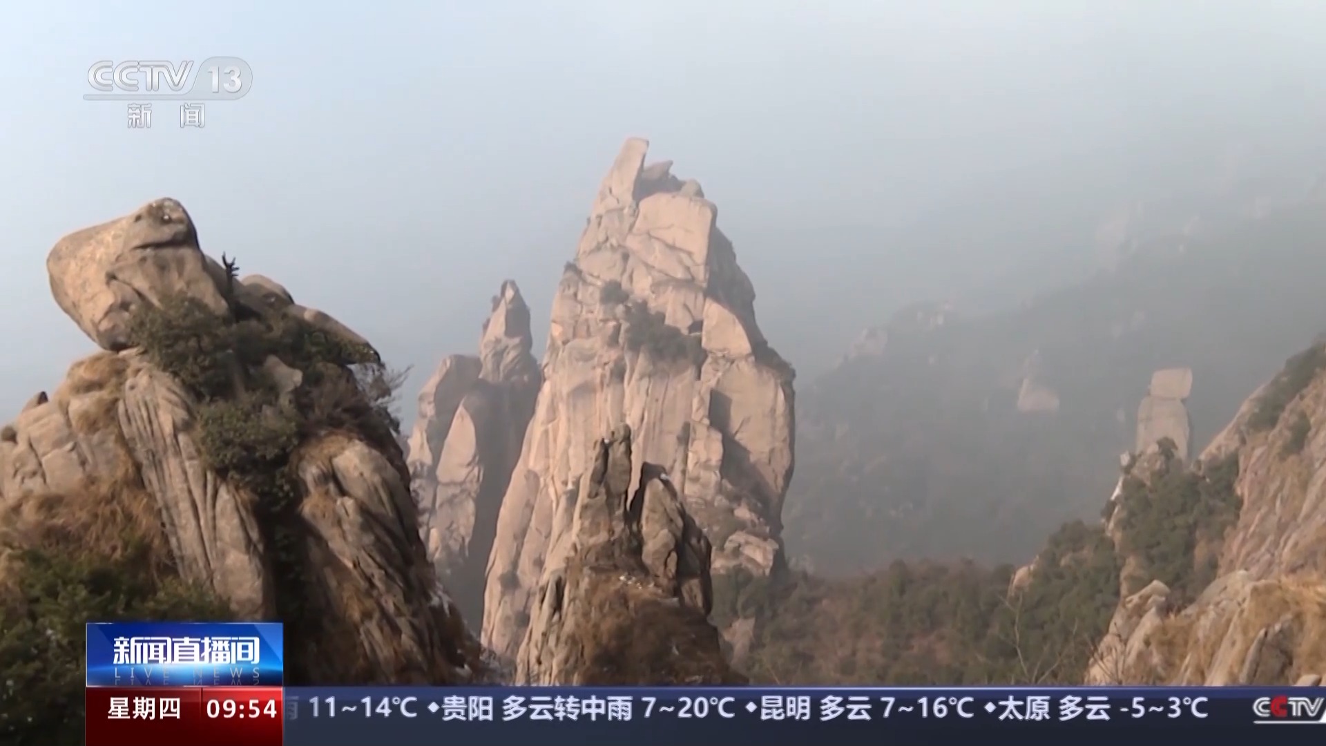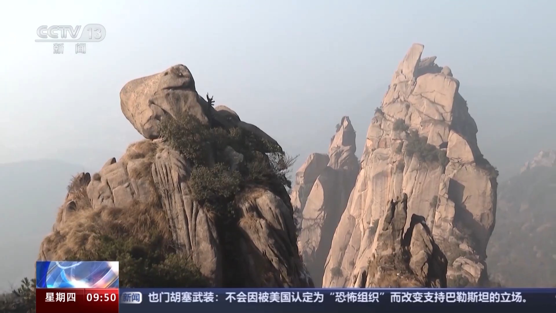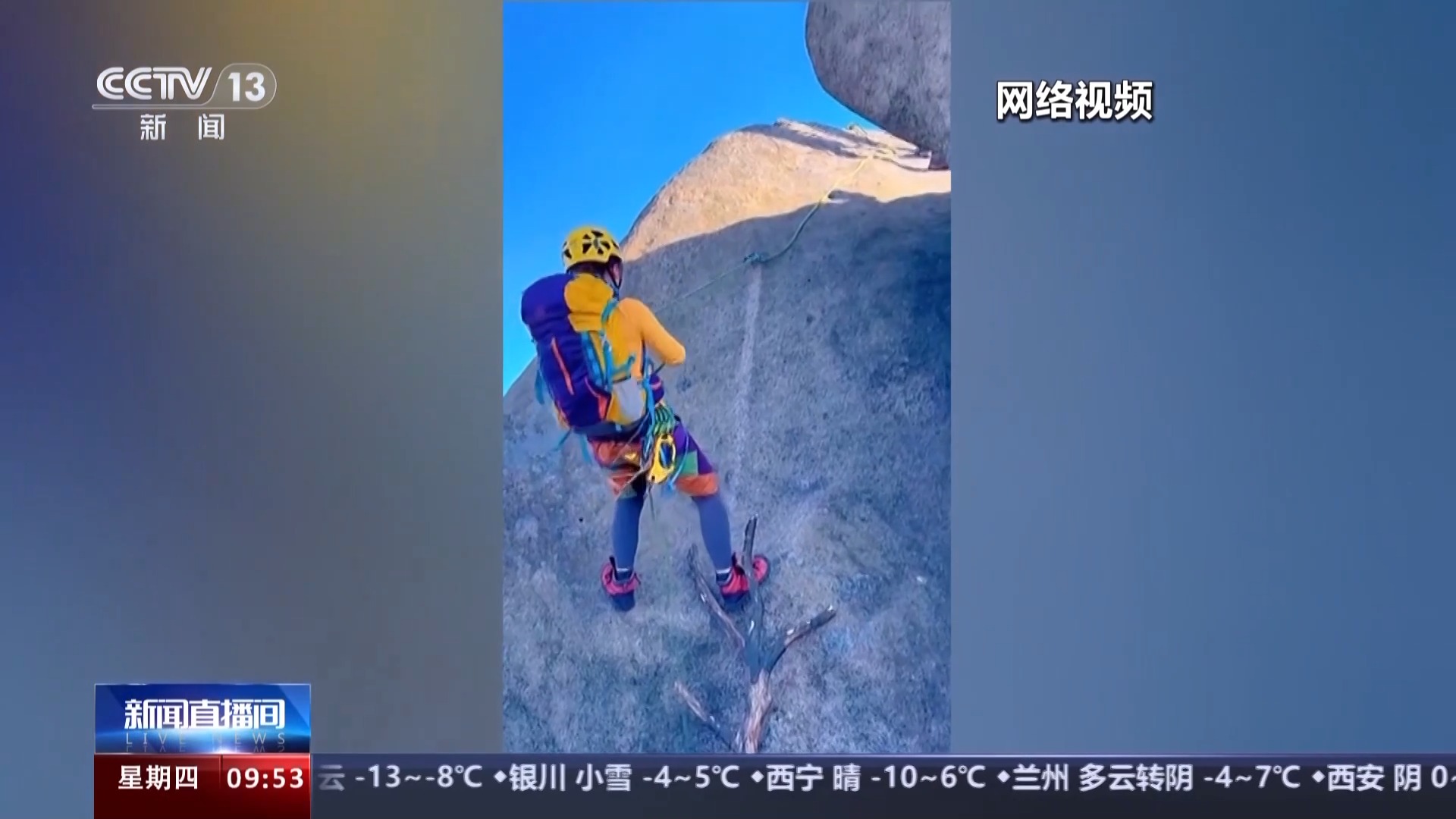 网络上的多段视频显示均为2024年1月初发布,定位在安徽省池州市九华山。画面显示,两人在山体高耸的岩石旁用绳索攀登,上方有几人在接应,沿着攀爬的路线看,岩体上有多个攀岩钉。