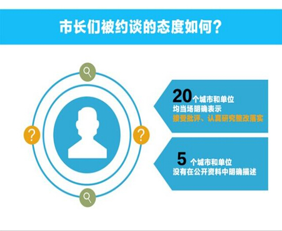 根据统计,目前25个城市或单位中,除了5个城市或单位因为没有在公开资料中明确描述,尚不清楚被约谈者的态度和当地的整改措施,其他20个城市和单位均当场明确表示接受批评、认真研究整改落实。