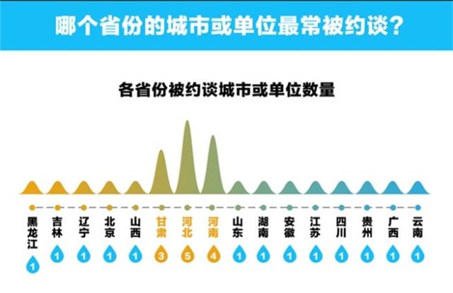 从约谈的时间频率看,约谈最多的月份是2015年2月和9月,分别约谈4个城市或单位,其次是2015年6月和7月,分别约谈了3个城市。