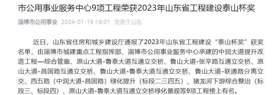 齐鲁网·闪电新闻1月20日讯 1月20日,记者从淄博市公用事业服务中心获悉,近日,山东省住房和城乡建设厅通报了2023年山东省工程建设“泰山杯奖”获奖名单,由淄博市城建重点工程指挥部、淄博市公用事业服务中心承建的中润大道提升改造工程—综合管廊、原山大道-鲁泰大道互通立交桥、鲁山大道-张辛路互通立交桥、原山大道-昌国路互通立交桥、鲁山大道-鲁泰大道互通立交桥、鲁山大道-联通路分离立交、西五路(中润大道-昌国路)绿化提升(标段二三四五)、猪龙河下游综合整治(标段三、标段四)、原山大道-鲁泰大道互通立交桥绿化景观等9项工程榜上有名。