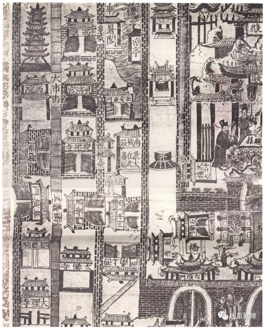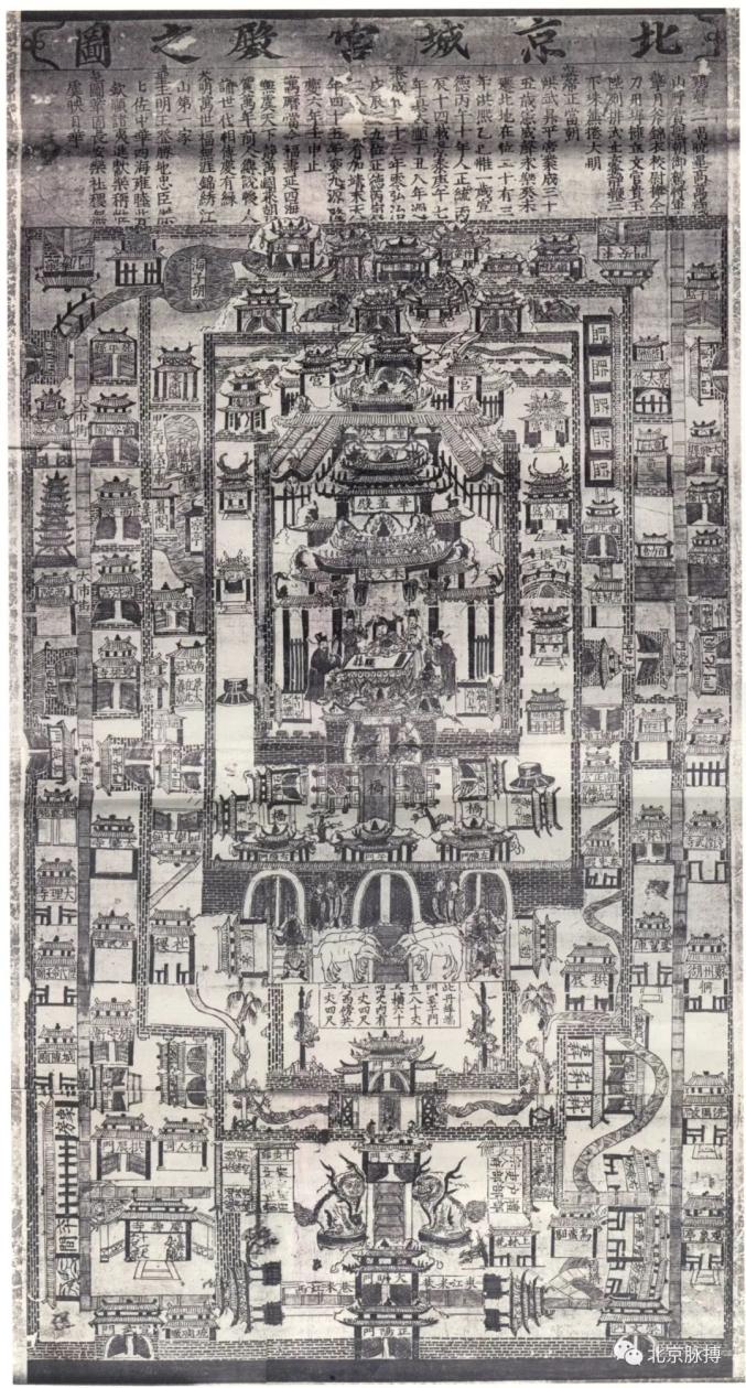 《北京城宫殿之图》成图于嘉靖十年至四十年(1531-1561年),万历年间(1573-1619年)刻本,墨印,为民间绘制。图廓纵100厘米,横50厘米。原图藏日本宫城县东北大学图书馆。该图是已知现存最早的单幅北京城地图,也是唯一的明代单幅北京城地图。