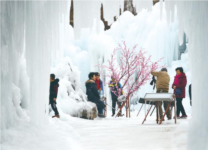 市民在沕沕水冰瀑美景前拍照留影。