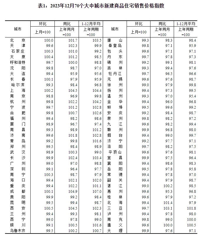 1月17日,国家统计局公布2023年12月份70个大中城市房价变动情况。根据简单算术平均计算,12月份全国70个城市新房价格指数环比下跌0.4%,跌幅与11月份持平;同比下跌0.9%,连续21个月同比下跌,且跌幅较前一个月扩大0.2个百分点。