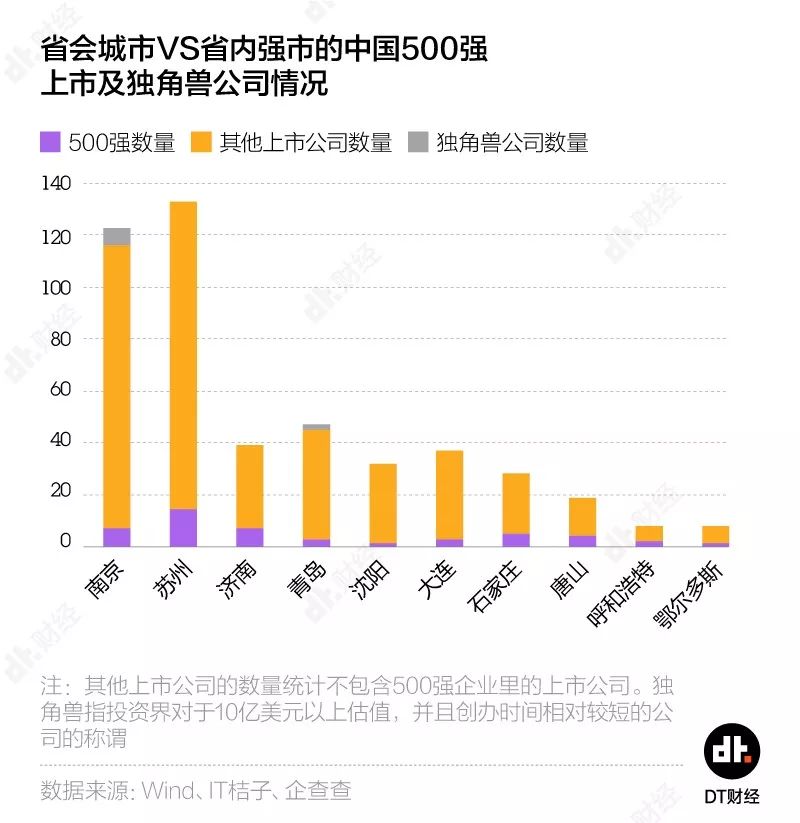 从数据来看,不管是五百强企业还是上市公司数量的PK,南京、济南、沈阳都需要抱团痛哭——苏州、青岛和大连都比这些省会城市拥有更多大企业。