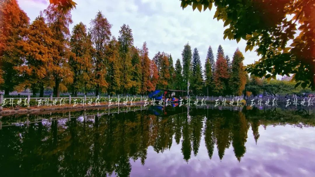 红的、黄的、绿的……在玉林市人民公园东面中间两侧的池塘,成排的落羽杉进入变色期叶子变得五彩斑斓,美不胜收。