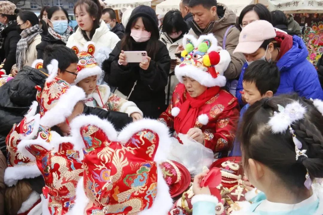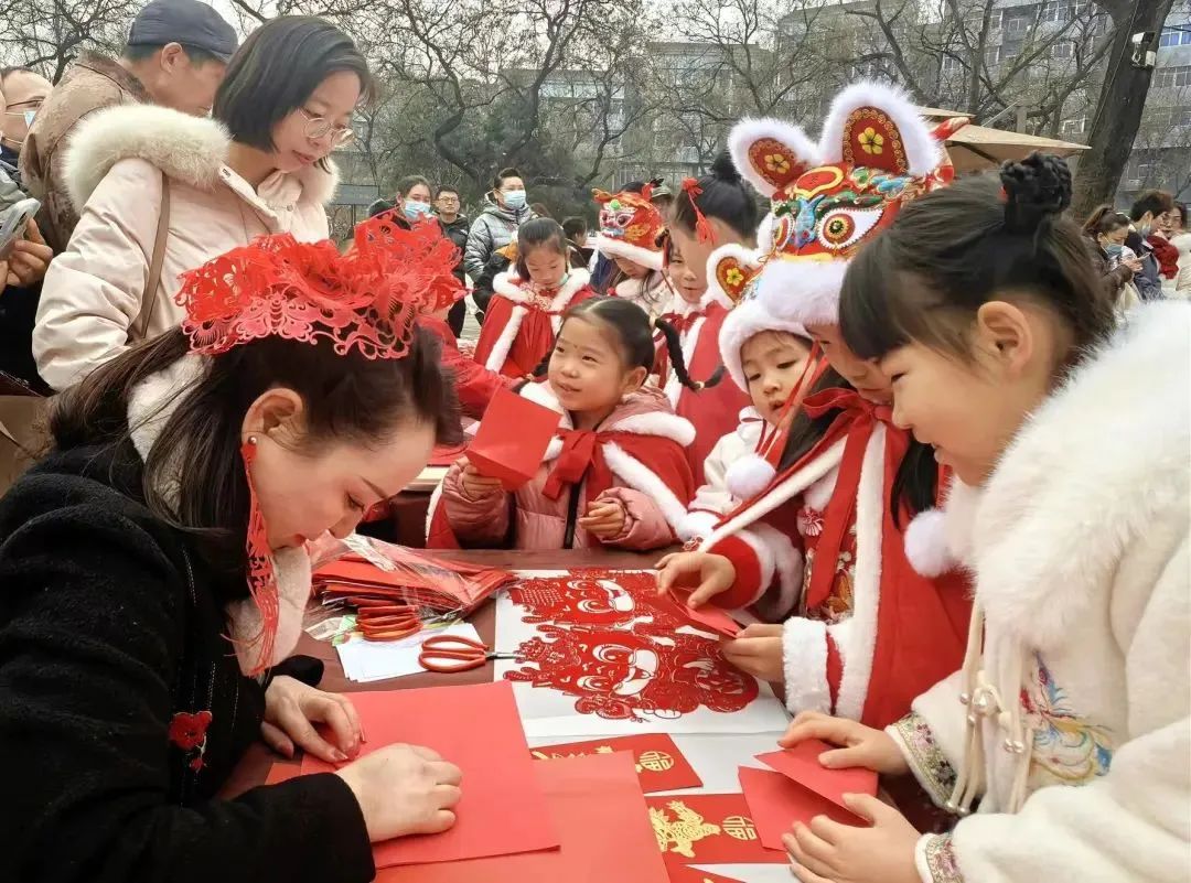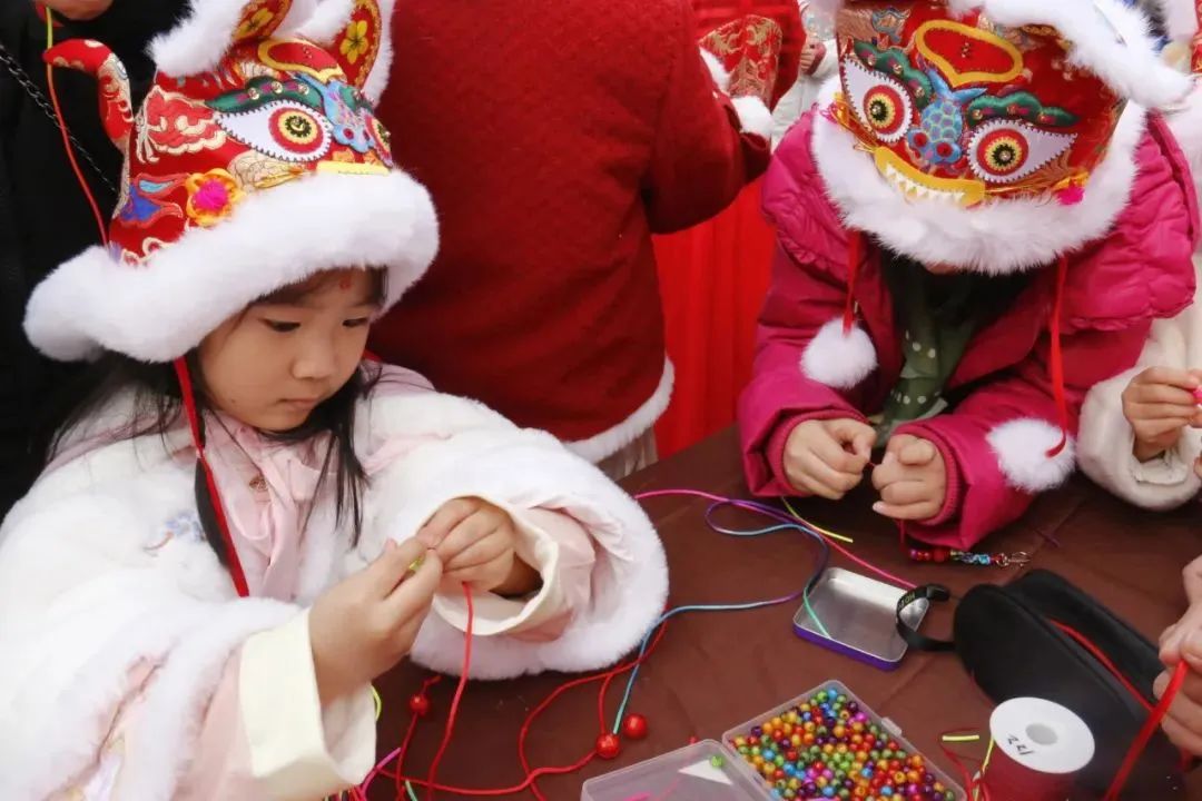 现场,非遗项目传承人与现场穿着中国传统服饰的小朋友们及游客互动,让他们亲身体验非遗项目的技艺和传承过程,感受传统年俗文化带来的乐趣。