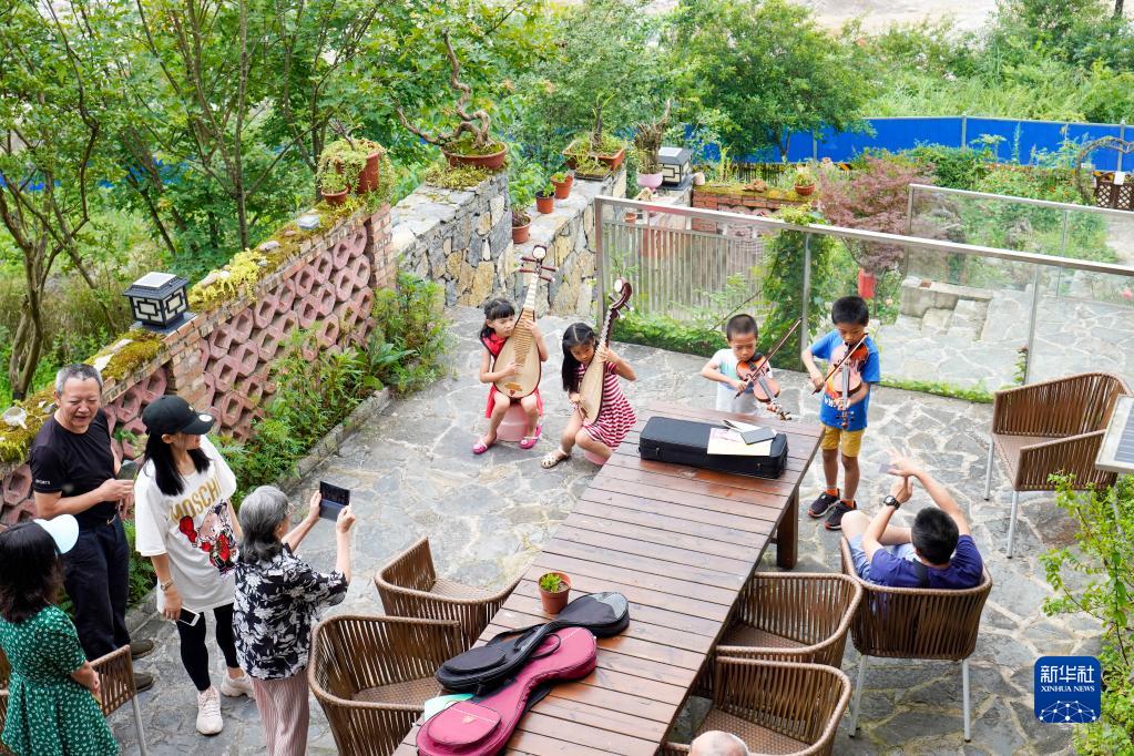 2020年7月30日,在重庆市武隆区仙女山街道荆竹村一家民宿内,游客在小院里休闲娱乐。新华社记者 刘潺 摄
