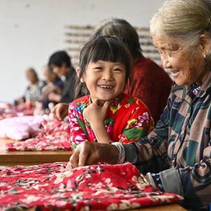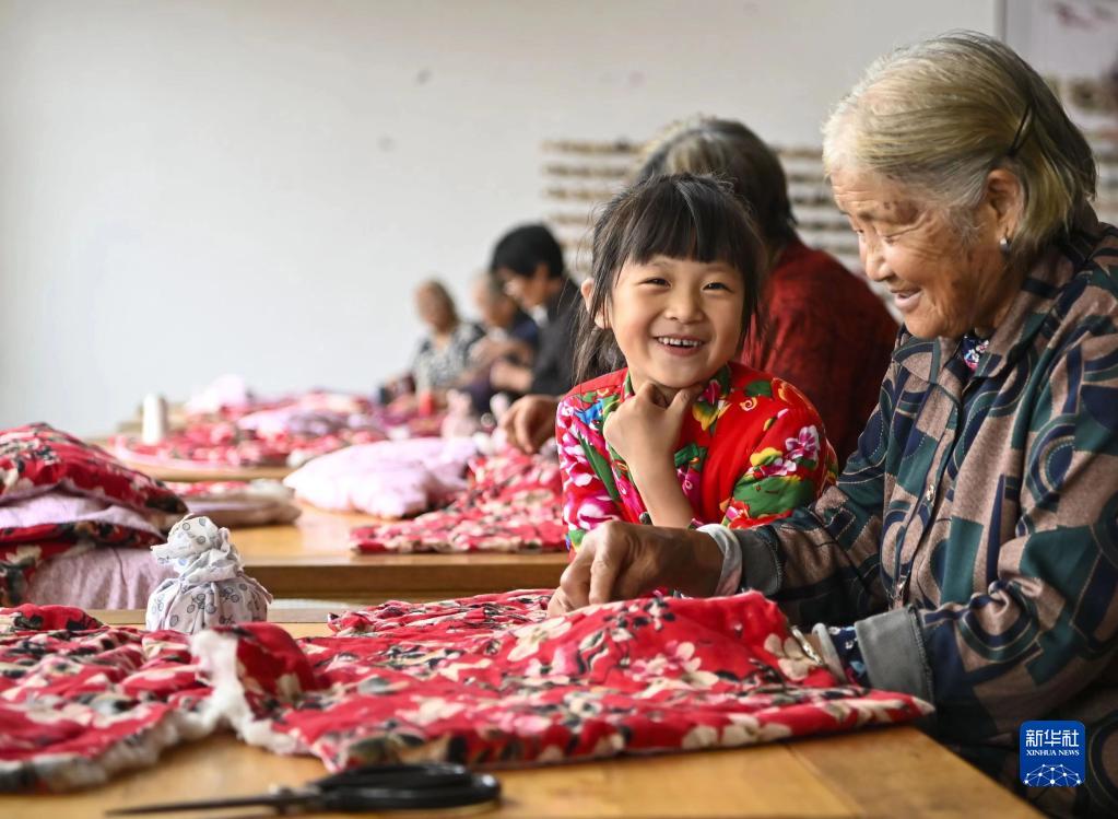 在山东沂水县吴家楼子村,一名老人在教重孙女沂蒙小棉袄的缝制手艺(资料照片)。新华社发 (王文剑 摄)