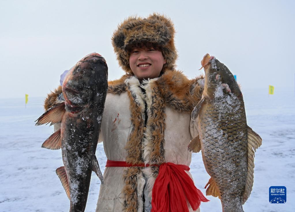 2023年1月7日,在新疆福海县第十六届乌伦古湖冬捕文化旅游节上,渔工展示捕到的鱼。新华社记者 李响 摄